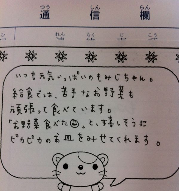 母の日の「心安らぐお話」の時に、「保育園の給食を好き嫌いしないで食べましょうね」というメッセージを母さまにお願いしました。
