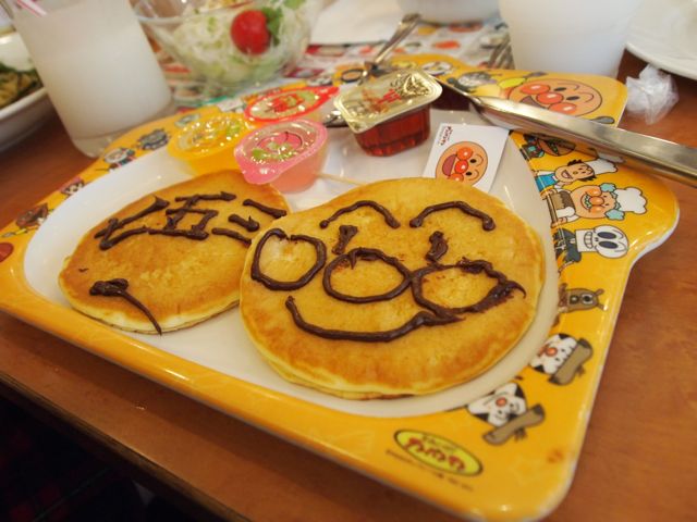 ホットケーキにチョコペンでアンパンマンを自分で描いて食べます。