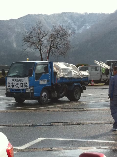 サービスエリアで休憩するたびいろんな災害支援のトラックとすれ違いました。雪が舞い散る北陸道SAにて。大阪ガスさん復興支援がんばってください!