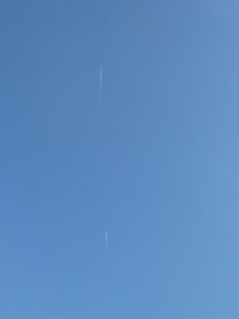 二機の飛行機が追いかけっこしているような飛行機雲。