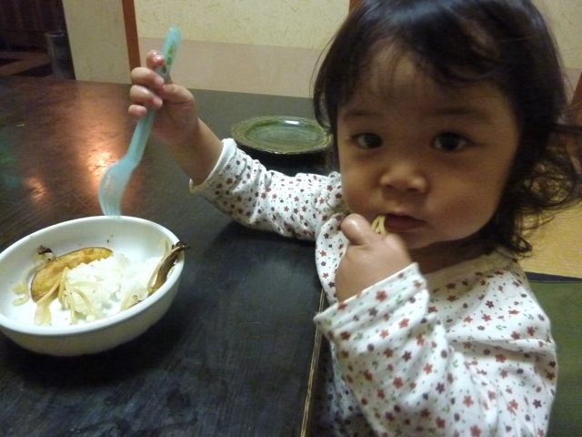 去年来た時はつかまり立ちしたばかりだったので、テーブルの上をもの倒そうとするのを押さえるのに必死だったんですが、今回は背の高いグラスを自分で飲むと言って、ママのズボンにばしゃーん…