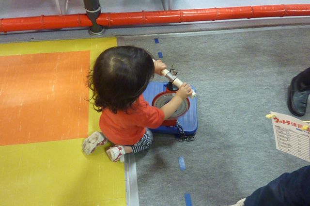 我が家は参加するには小さすぎるかなぁとジャングルジムランド側で遊んでたんですが、ヒーローがパトロールに行ってからの空いた頃を見計らって、面白そうなので親子三人で参加!