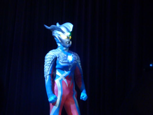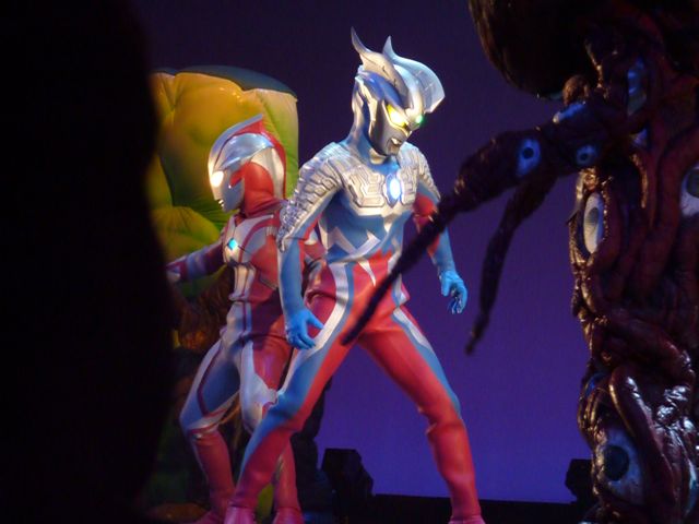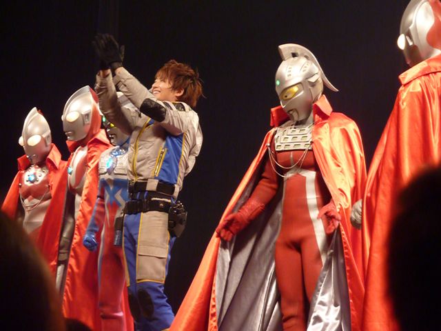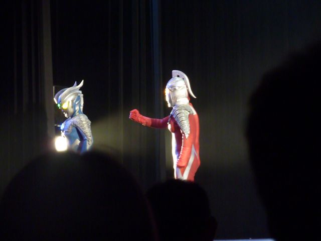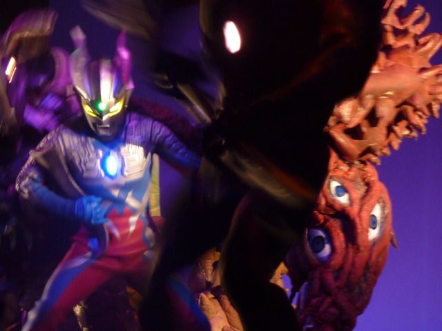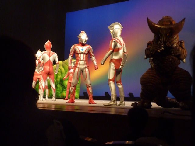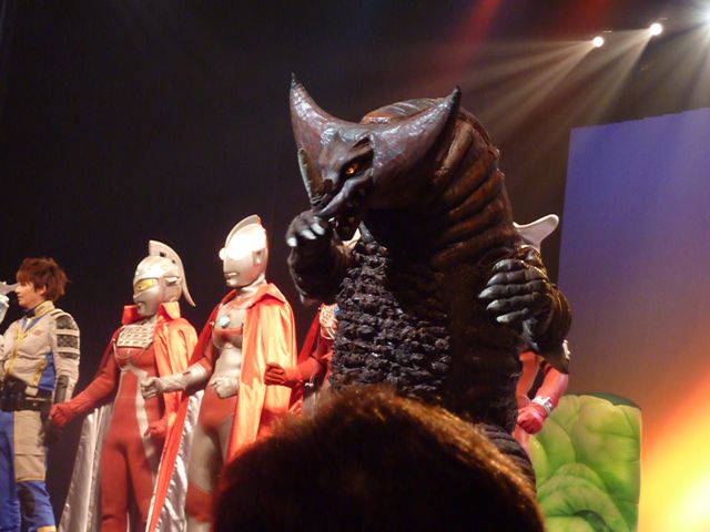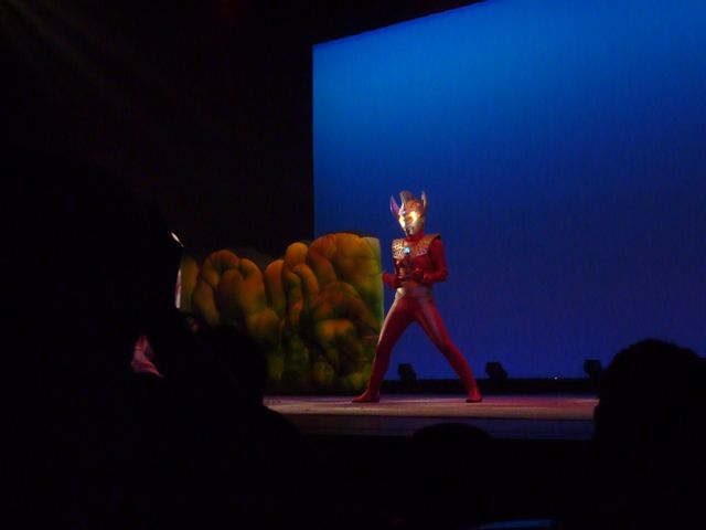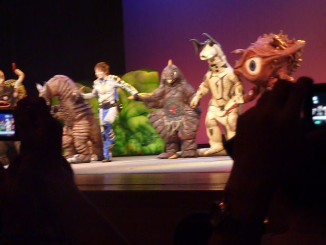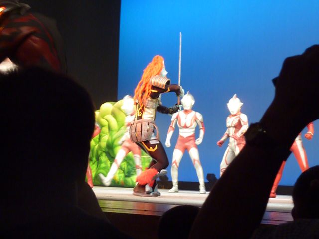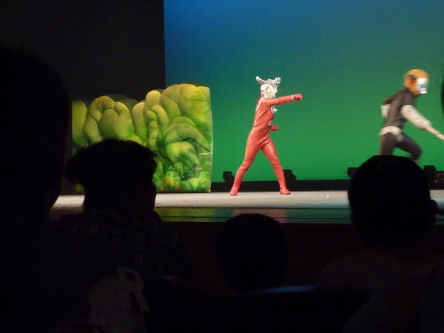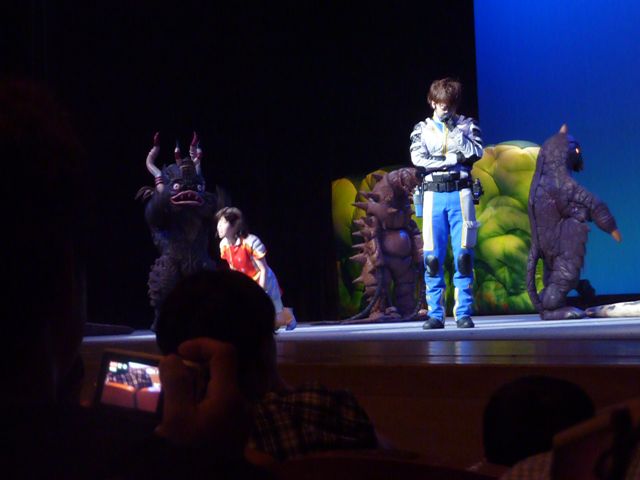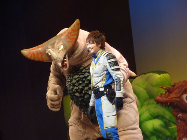 舞台の左袖から飛び出してきたマグマ星人を追いかけて、ステージ中央でバトル☆